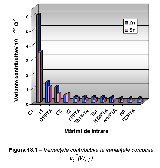 Pentru a ilustra utilizarea modelului la calculul incertitudinilor propagate la temperaturi intermediare am ales domeniul cuprins între 0 °C și 419,527 °C [4,5]. Punctele fixe de definiție specificate în SIT-90 pentru etalonarea TERP în acest domeniu sunt: punctul triplu al apei (0,01 °C) și punctele de solidificare ale staniului (231,928 °C) și zincului (419,527 °C). Setul mărimilor de intrare utilizate în această demonstrație a modului de aplicare a MAI este prezentat în Tabelul 18.2. Figura 18.1 prezintă cele mai mari varianțe contributive la varianța compusă uc2(WPF), evaluate la punctele fixe ale zincului și staniului. Dintre aceste varianțe contributive, cea simbolizată "I1I2", este asociată cu mărimile de intrare corelate I1 și I2. Incertitudinile de etalonare uc(WPF) evaluate pe baza modelului complet sunt egale cu 0,73 mK la punctul de solidificare al Sn și cu 0,99 mK la punctul de solidificare al Zn.