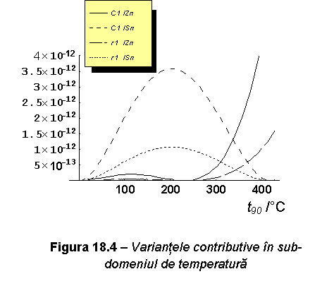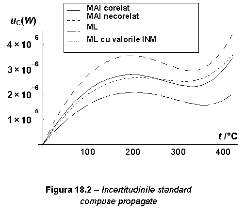 În Figura 18.2 se poate vedea o reprezentare a incertitudinilor standard compuse propagate de la incertitudinile de etalonare la punctele fixe, așa cum au fost determinate cu MAI, și care se bazează pe datele de intrare din Tabelul 18.2. Sunt prezentate două cazuri: cazul în care sunt luate în considerare toate corelațiile specificate anterior (curba MAI corelat) și cazul în care nu este luată în considerare nici o corelație (curba MAI necorelat). Contribuția termenilor de corelație (în special cea dintre I1 și I2) se dovedește a fi semnificativă (aproximativ 27% din uc(W) determinată cu MAI corelat la TZn și TSn). Pe același grafic sunt reprezentate două curbe calculate cu modelul [7]: cazul în care s-au folosit datele de intrare din [7] (curba ML) și cazul în care s-au folosit datele de intrare din Tabelul 18.2 (curba ML cu valorile INM); în acest ultim caz, diferențele maxime față de curba MAI corelat sunt, la 350 °C, de 11 % din uc(W) cu MAI corelat.