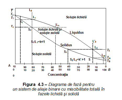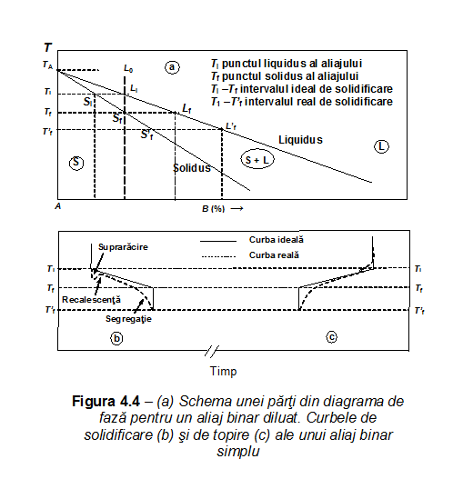 Figura 4.3 arată diagrama de fază [8,9,10] - denumită și diagrama binară - pentru un sistem binar A-B (C = 2). Cei doi componenți sunt complet miscibili în ambele faze, solidă și lichidă (de exemplu, sistemul Ag-Au sau Bi-Sb [10]). Compoziția variază de la 100 % element A, la stânga diagramei, până la 100 % element B, la dreapta diagramei, trecând prin toate compozițiile posibile. TA este punctul de solidificare al metalului pur A iar TB este punctul de solidificare al metalului pur B. Diagrama de fază reprezintă grafic compozițiile celor două faze - solidă și lichidă - în funcție de temperatură. Curba solidus reprezintă temperaturile la care o soluție solidă, de orice compoziție dată, începe să se topească. Sub această curbă, sistemul este stabil în fază solidă, adică aliajele sistemului care au temperaturile și compozițiile corespunzătoare punctelor situate în această arie sunt monofazice. Curba liquidus reprezintă temperaturile la care o soluție lichidă, de orice compoziție dată, începe să se solidifice (presupunând că nu are loc supra-răcirea). Deasupra acestei curbe, sistemul este stabil în fază lichidă, adică aliajele sistemului care au temperaturile și compozițiile corespunzătoare punctelor situate în această arie sunt monofazice. În aria cuprinsă între curba solidus și curba liquidus, orice aliaj al sistemului se află sub forma unui amestec de faze și anume, soluție lichidă și cristale de soluție solidă iar compoziția fiecărei faze este dată de intersecția liniei de temperatură cu curba solidus și, respectiv, liquidus. În cazul unei soluții foarte diluate formate dintr-un element majoritar (solventul) în care este dizolvată o cantitate foarte mică dintr-un alt element (solvitul), panta curbei solidus depinde de natura celor două elemente și, în particular, de solubilitatea relativă a solvitului în faza solidă a solventului. Un solvit care este mai solubil în faza lichidă decât în cea solidă coboară punctul de solidificare, în timp ce unul care este mai solubil în faza solidă ridică punctul de solidificare. Așadar, temperaturile de solidificare ale aliajelor sunt fie mai coborâte, fie mai ridicate față de cele ale elementelor pure, în funcție de tipul impurităților dizolvate. Vom analiza, mai întâi, cazul solvitului care coboară temperatura de solidificare a metalului în care este dizolvat. În diagrama binară din Figura 4.3, cazul este reprezentat în partea stângă a desenului, în care: ● elementul majoritar este A, ● solvitul B este mai solubil în faza lichidă decât în cea solidă. O reprezentare mărită a zonei, care evidențiază efectul unei mici cantități de element B în elementul A aproape pur, este arătată în Figura 4.4 (a).