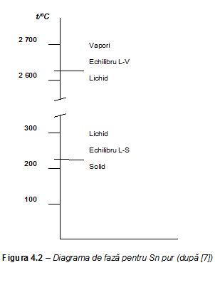 Figura 4.2 [7] reprezintă diagrama de fază tot pentru o substanță chimic pură ca și Figura 4.1, numai că, în acest caz, stările fizice ale sistemului sunt reprezentate în funcție de temperatură și compoziție. Este vorba de un sistem metalic (staniu) ideal de pur, având, deci, un singur component (C = 1). Într-un astfel de sistem, morfologia frontului de cristalizare și forma cristalelor rezultate sunt determinate în totalitate de condițiile regimului termic în care se produce cristalizarea. Dacă temperatura unui volum de staniu aflat în fază solidă crește, se va atinge un punct de tranziție de fază și anume, punctul de topire al staniului (231,928 ºC, conform SIT-90), la care începe să se formeze staniu lichid. În cursul topirii se absoarbe căldură. Tranziția continuă până când tot staniul devine lichid. Pe durata tranziției, temperatura este invariantă deoarece căldura furnizată din exterior este absorbită exclusiv pentru avansarea topirii și nu determină creșterea temperaturii metalului. Când staniul este topit în întregime, furnizarea suplimentară de căldură va determina din nou creșterea temperaturii, până când metalul lichid începe să fiarbă, producându-se tranziția din faza lichidă în faza gazoasă. Diagrama din Figura 4.2 este o idealizare, întrucât în lumea reală nu există metale cu puritatea de 100 %. Prin urmare, orice metal cu cea mai bună puritate disponibilă trebuie să fie tratat ca un aliaj (soluție diluată), adică un amestec format dintr-o componentă majoritară, metalul A și alte componente metalice sau nemetalice B, C etc. dizolvate in metalul de bază în concentrații foarte mici. Numai că tranziția de fază a unui aliaj nu se mai produce la o valoare unică a temperaturii, ca în cazul metalelor pure, ci într-un interval de temperatură.