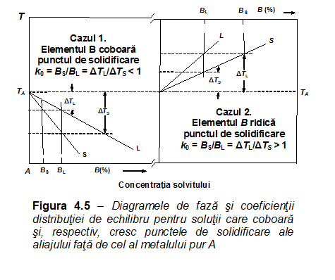 Figura 4.3 arată diagrama de fază [8,9,10] - denumită și diagrama binară - pentru un sistem binar A-B (C = 2). Cei doi componenți sunt complet miscibili în ambele faze, solidă și lichidă (de exemplu, sistemul Ag-Au sau Bi-Sb [10]). Compoziția variază de la 100 % element A, la stânga diagramei, până la 100 % element B, la dreapta diagramei, trecând prin toate compozițiile posibile. TA este punctul de solidificare al metalului pur A iar TB este punctul de solidificare al metalului pur B. Diagrama de fază reprezintă grafic compozițiile celor două faze - solidă și lichidă - în funcție de temperatură. Curba solidus reprezintă temperaturile la care o soluție solidă, de orice compoziție dată, începe să se topească. Sub această curbă, sistemul este stabil în fază solidă, adică aliajele sistemului care au temperaturile și compozițiile corespunzătoare punctelor situate în această arie sunt monofazice. Curba liquidus reprezintă temperaturile la care o soluție lichidă, de orice compoziție dată, începe să se solidifice (presupunând că nu are loc supra-răcirea). Deasupra acestei curbe, sistemul este stabil în fază lichidă, adică aliajele sistemului care au temperaturile și compozițiile corespunzătoare punctelor situate în această arie sunt monofazice. În aria cuprinsă între curba solidus și curba liquidus, orice aliaj al sistemului se află sub forma unui amestec de faze și anume, soluție lichidă și cristale de soluție solidă iar compoziția fiecărei faze este dată de intersecția liniei de temperatură cu curba solidus și, respectiv, liquidus. În cazul unei soluții foarte diluate formate dintr-un element majoritar (solventul) în care este dizolvată o cantitate foarte mică dintr-un alt element (solvitul), panta curbei solidus depinde de natura celor două elemente și, în particular, de solubilitatea relativă a solvitului în faza solidă a solventului. Un solvit care este mai solubil în faza lichidă decât în cea solidă coboară punctul de solidificare, în timp ce unul care este mai solubil în faza solidă ridică punctul de solidificare. Așadar, temperaturile de solidificare ale aliajelor sunt fie mai coborâte, fie mai ridicate față de cele ale elementelor pure, în funcție de tipul impurităților dizolvate. Vom analiza, mai întâi, cazul solvitului care coboară temperatura de solidificare a metalului în care este dizolvat. În diagrama binară din Figura 4.3, cazul este reprezentat în partea stângă a desenului, în care: ● elementul majoritar este A, ● solvitul B este mai solubil în faza lichidă decât în cea solidă. O reprezentare mărită a zonei, care evidențiază efectul unei mici cantități de element B în elementul A aproape pur, este arătată în Figura 4.4 (a).
